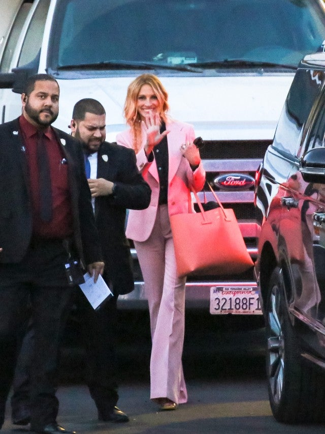 The Oscar winner looked edgy as she arrived at the studio earlier in the day, sporting an all-black outfit with a blazer, graphic tee, leather pants and sandals. Her pink hair added to her rock-n-roll look.