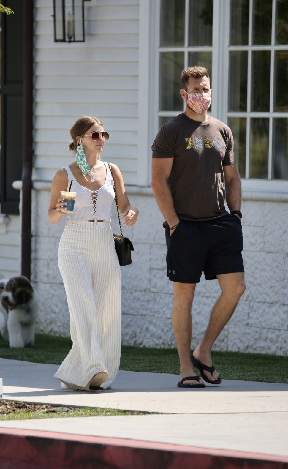 Hough and Laich were photographed dining at a romantic Italian restaurant in Los Angeles, sipping on rosé and later grabbing coffee. The 32-year-old dancer wore flowy white pants and a matching tank top for the occasion, while Laich, 37, opted for a graphic tee, shorts and flip flops.