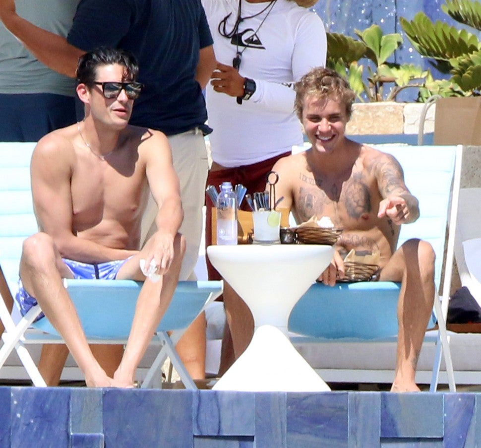 Bieber, who was all smiles showed off his toned shirtless body in dark-colored swim trunks, enjoyed Casamigos iced bell shots with a friend before heading to the bar.