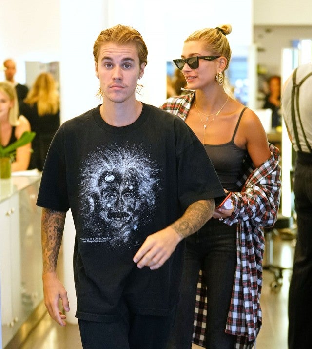 The inseparable pair visited the establishment so that the 24-year-old pop star could get his lengthy blonde locks trimmed. While at the salon, Bieber sported a black shirt with a print of Albert Einstein’s face on it, matching black athletic shorts, black socks and white slippers. As for Baldwin, the 21-year-old model wore jeans and a gray tank-top with an oversized plaid shirt over top.