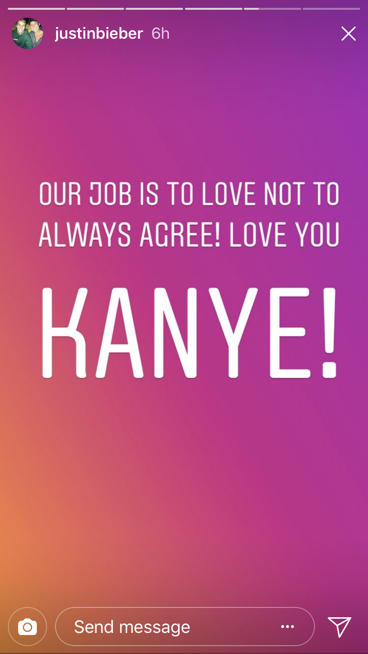 “Our job is to love not to always agree!” Bieber wrote, offering a note of positivity in white text on a colorful background. “Love you Kanye!”