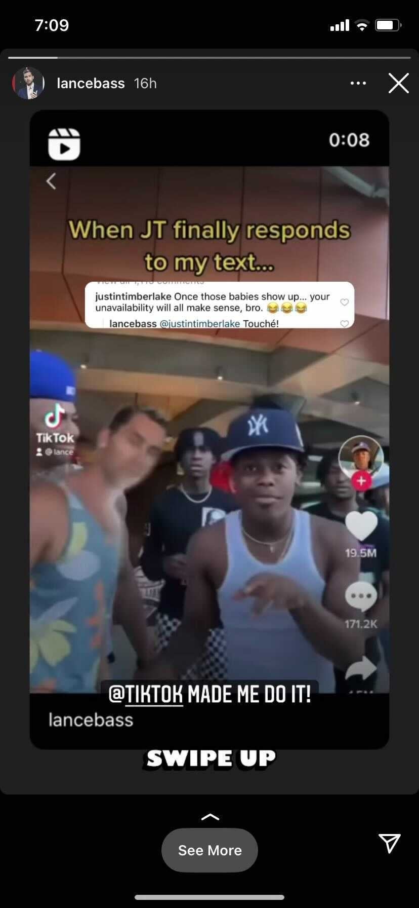 Timberlake and Bass, along with Chris Kirkpatrick, JC Chasez and Joey Fatone, were members of '90s boyband *NSYNC. The funny social media exchange started when Bass, 42, shared a TikTok of himself excitedly dancing, writing, "When JT finally responds to my text."