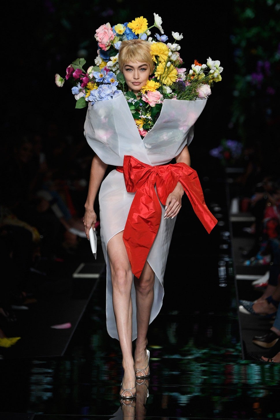 The models turned heads dressed as bouquets of flowers at the Moschino show during Milan Fashion Week on Thursday.
