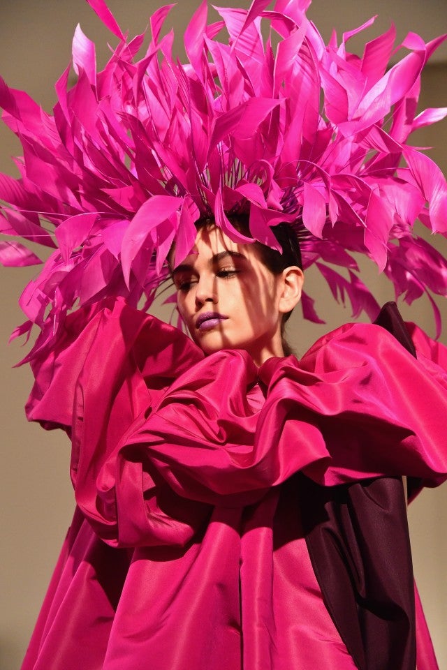 Gerber strutted down the runway in a voluminous mid-length hot fuchsia creation that featured a dramatic and oversized ruffled collar. The ensemble was paired with sheer black tights and gold heels that featured a single strap across the toes and ankle.