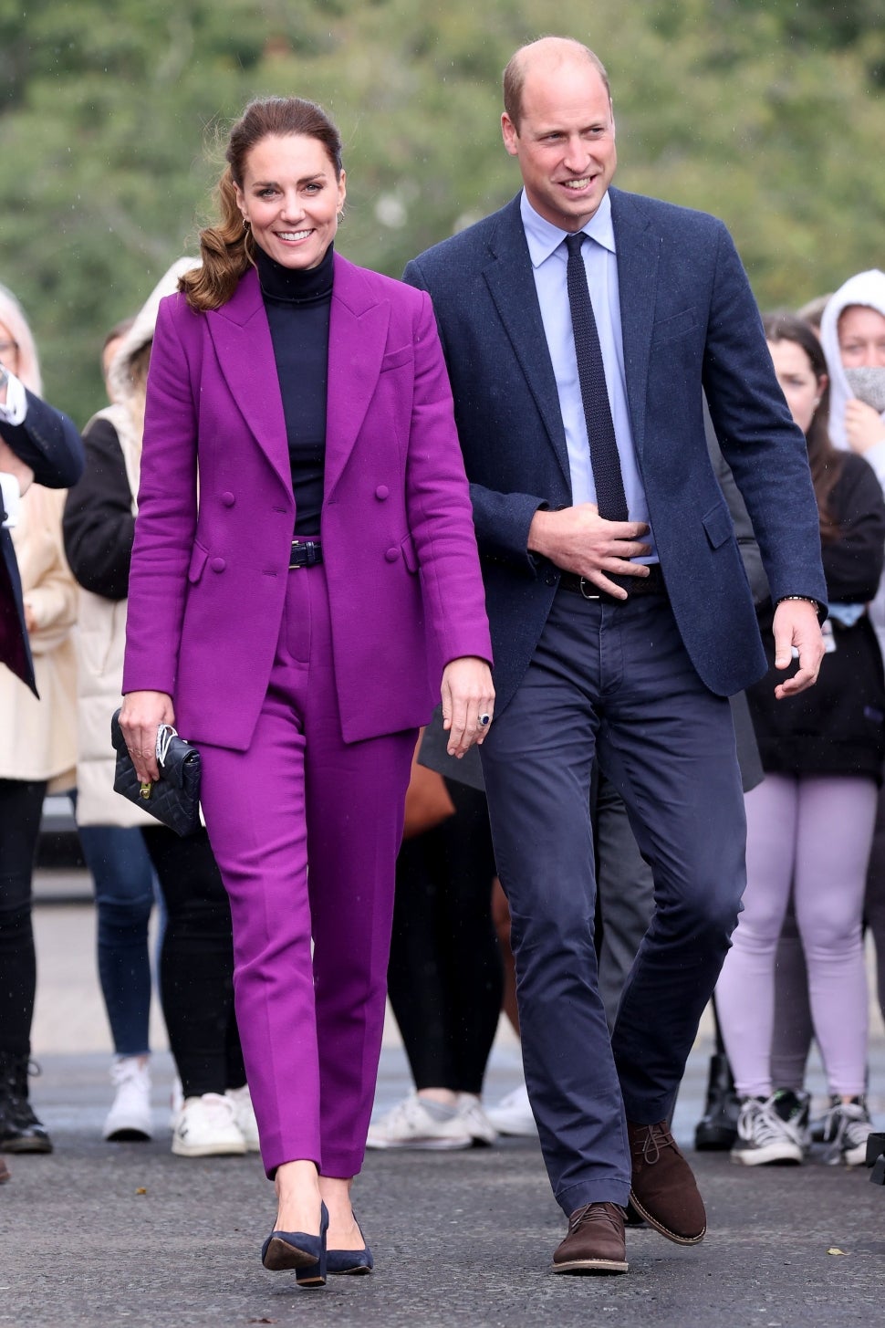 Kate looked chic and bright in a bold purple Emilia Wickstead pantsuit with a black turtleneck. She paired the look with black heels and a sleek ponytail.