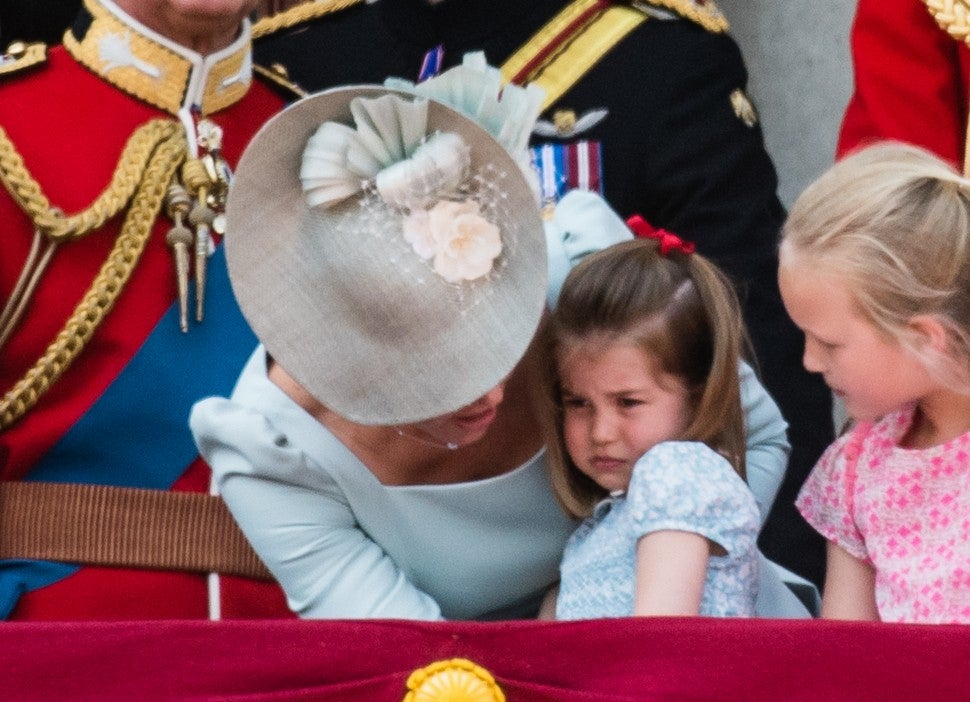Charlotte quickly calmed down, and joined the rest of the group -- including Prince William, Prince George (who was hilariously put in his place by his older cousin on the balcony), Queen Elizabeth, Prince Charles, Prince Harry and Meghan Markle (who made headlines for breaking royal protocol with her off-the-shoulder ensemble).
