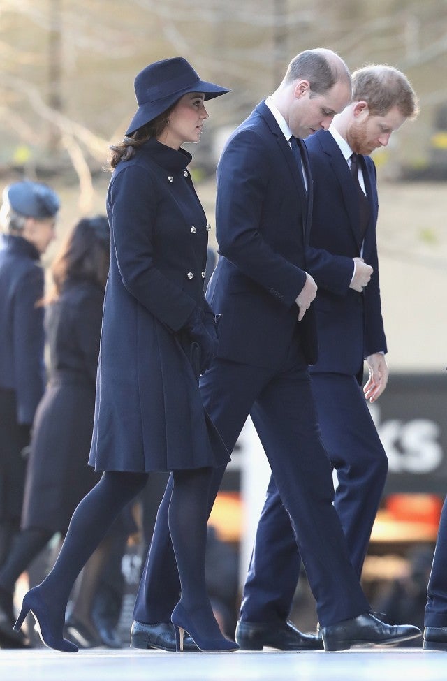 Middleton, who is currently pregnant with her third child, wore a button-down black peacoat and dress with a matching hat, while William and Harry each wore black suits.