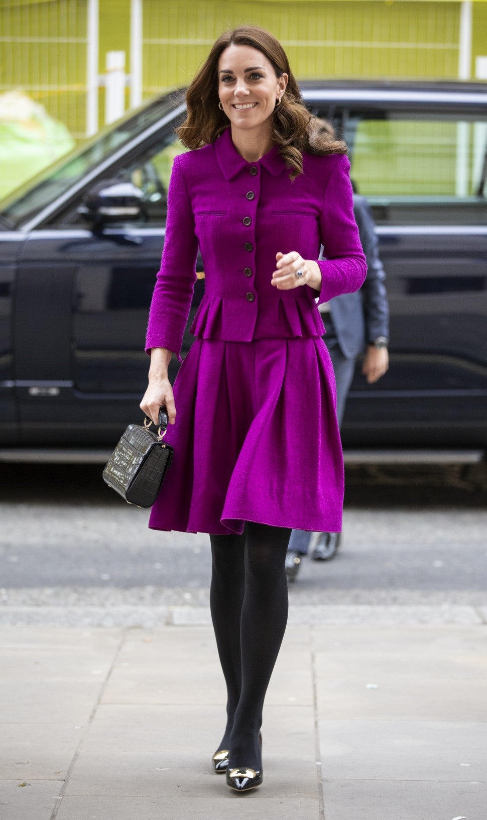 The Duchess of Cambridge stepped out on Wednesday in a bright purple buttoned Oscar de la Renta skirt suit teamed with black tights, Rupert Sanderson patent leather pumps and an Aspinal of London croc top-handle bag on her way to the Royal Opera House in London.