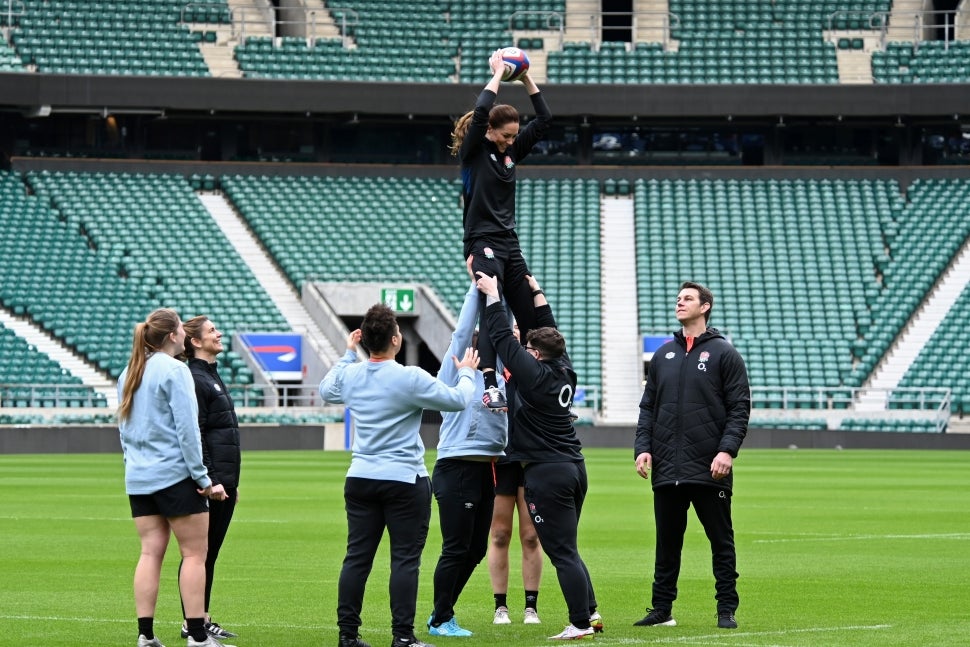 Kate has jumped into the role feet first as she joined in an England rugby training session at the Twickenham Stadium in London on Wednesday. The duchess practiced some drills and was even lifted into the air to catch a ball as the players cheered.