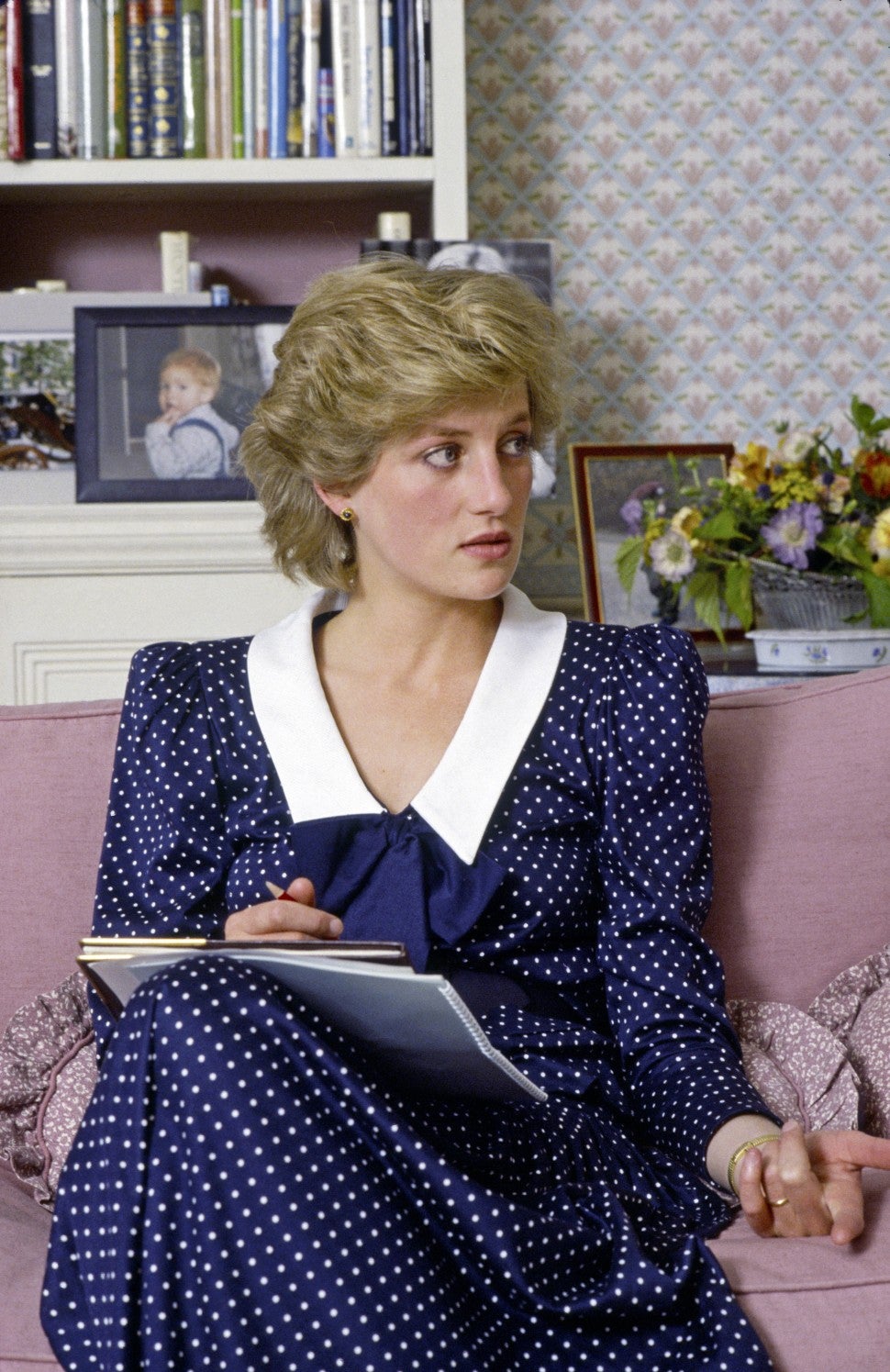 The Duchess of Cambridge paired the style with delicate pearl drop earrings, suede heels by Emmy London and a navy purse by Smythson. The mid-length dress with vintage-inspired contrast collar and cuffs and large white buttons is nearly identical to a look that Diana wore during a photo shoot at Kensington Palace back in October 1985.