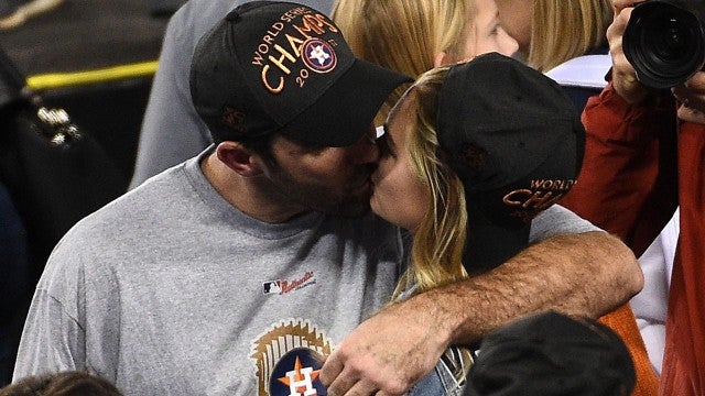 After the Houston Astros beat the Los Angeles Dodgers on Wednesday night, the 34-year-old MLB pitcher's fiancee, Kate Upton, ran down on the field at Dodger Stadium to greet her guy with a big smooch!