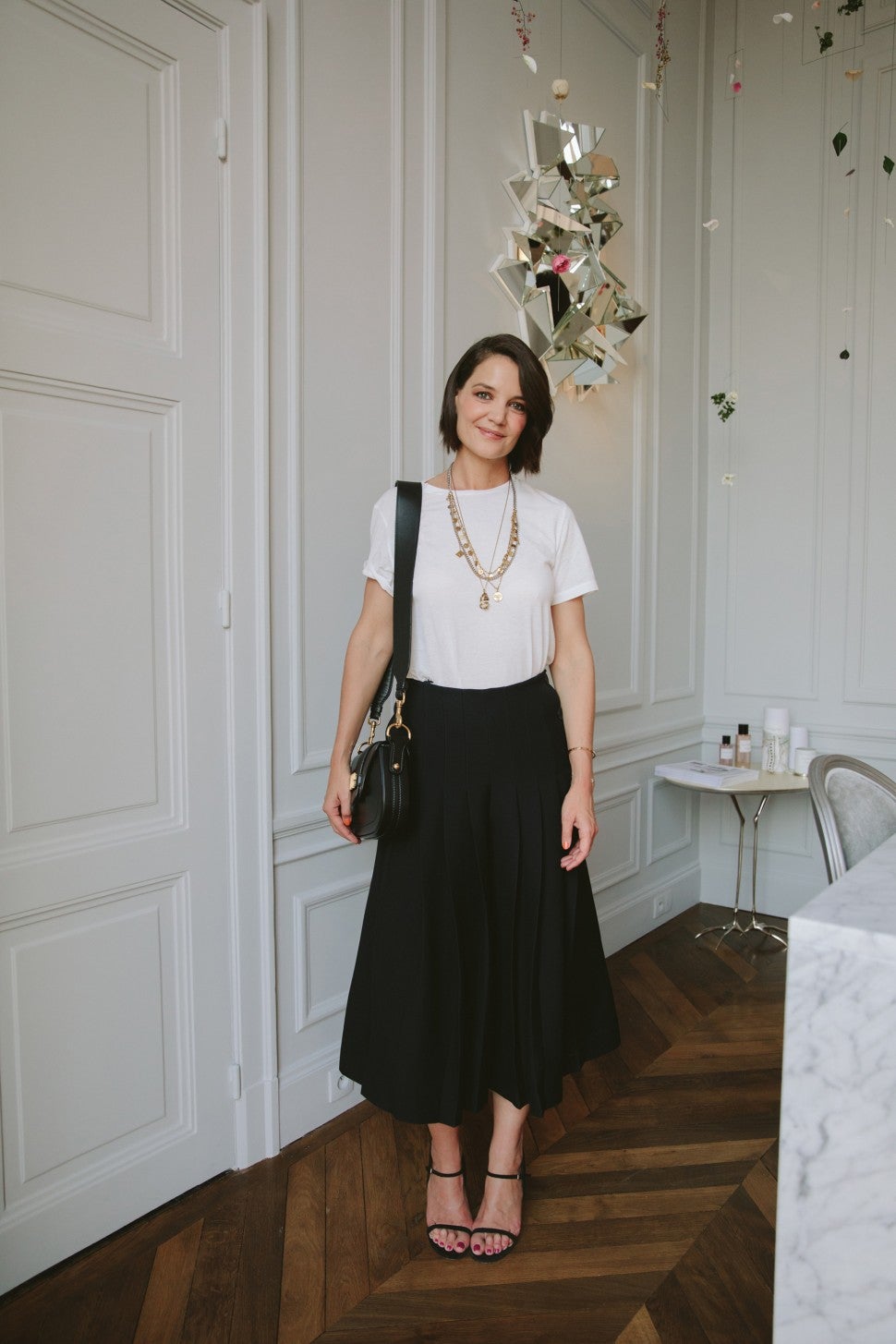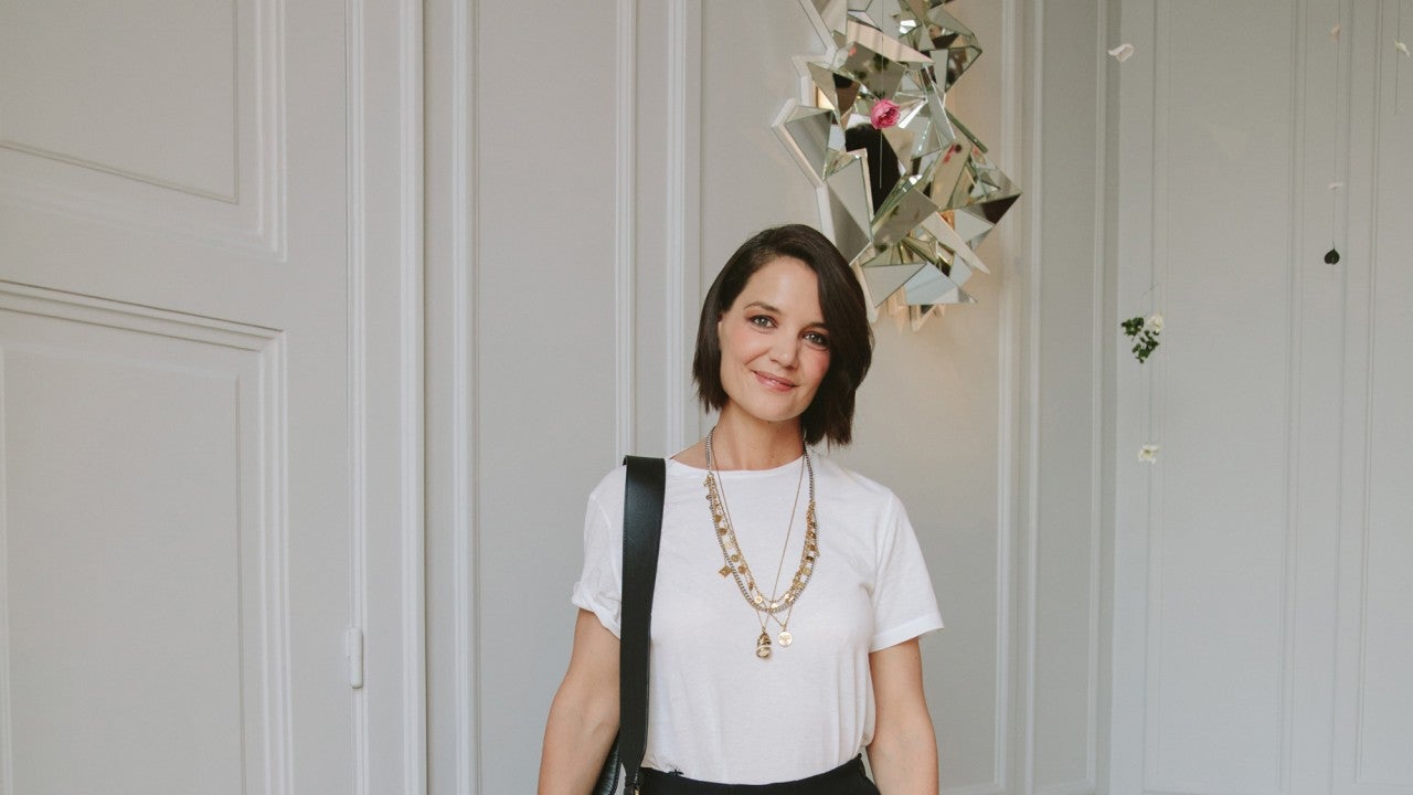 One outfit that captured our attention the most? Katie Holmes' white T-shirt. While it may not be a statement ensemble, the 39-year-old actress demonstrates a polished, elevated way to don the wardrobe basic -- tuck it in an elegant black midi skirt and embellish with layers of longline necklaces, a sleek bag and strappy heels. Done and done.