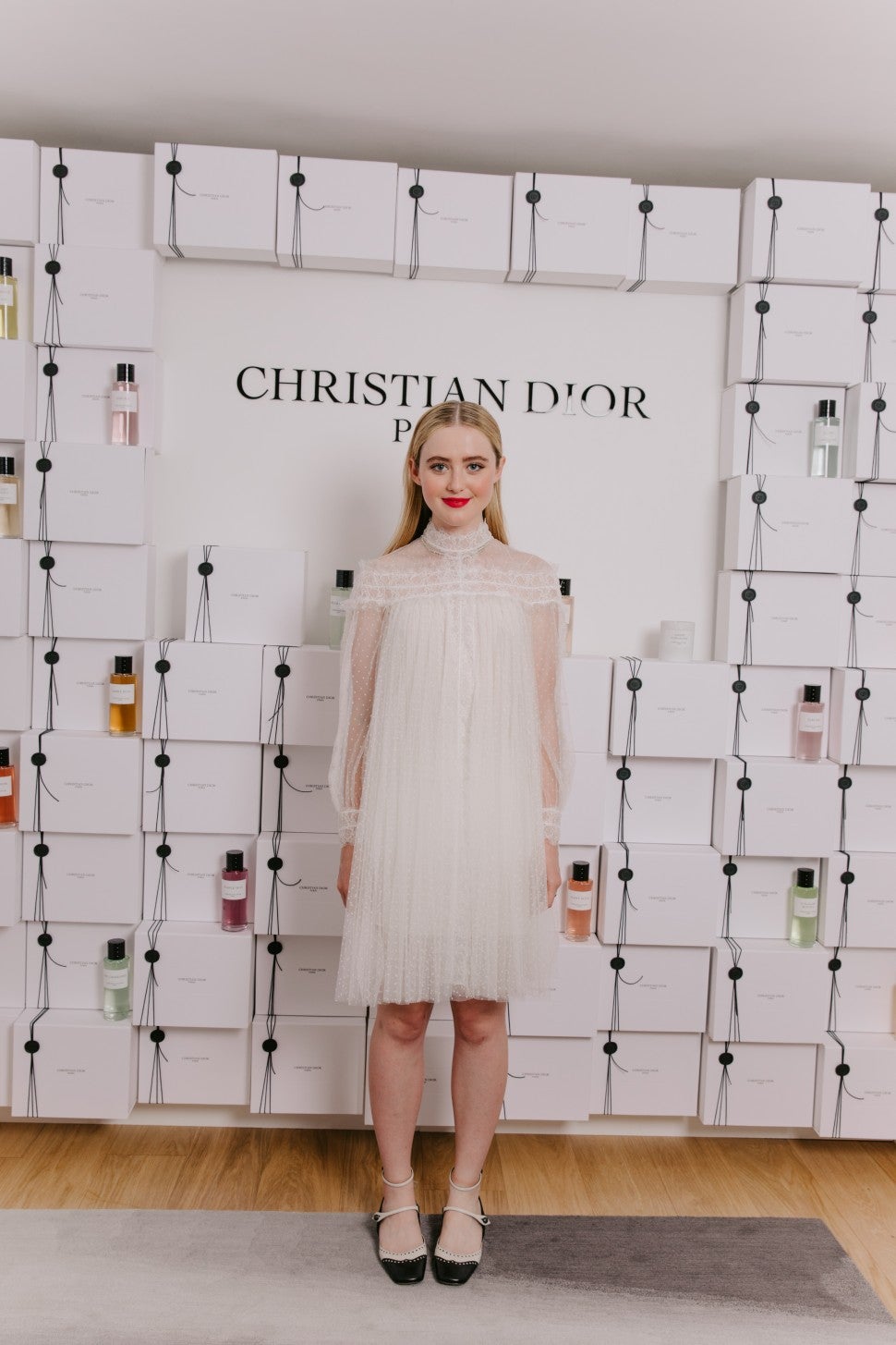 Big Little Lies' Kathryn Newton was ultra-feminine in a frothy white tulle mini and patent leather two-tone Mary Jane shoes.