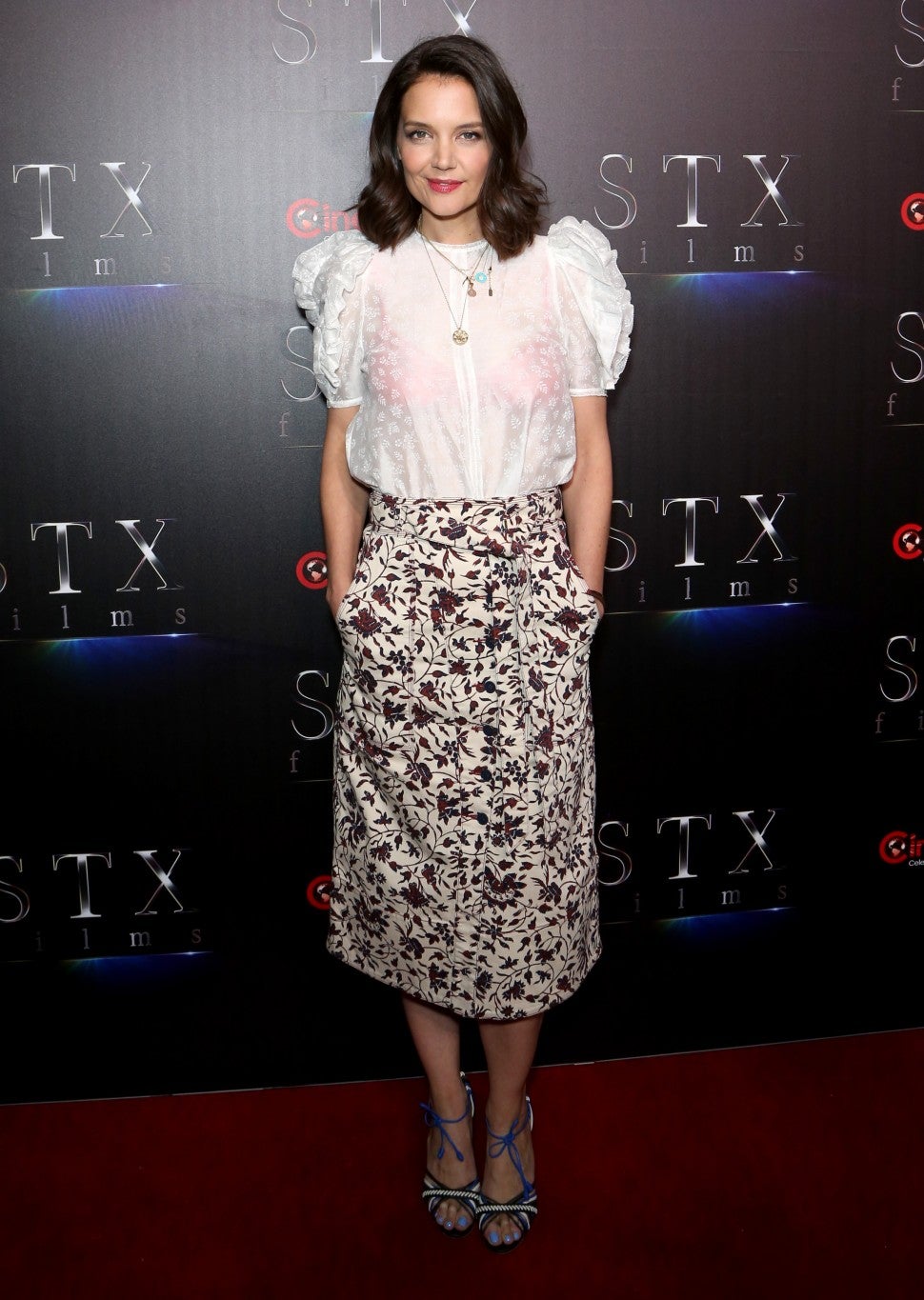 The 40-year-old actress stood out at STX Films' presentation during CinemaCon 2019 in Las Vegas, Nevada, pairing a ruffled white see-through blouse with a bright bra, floral pencil skirt and colorful heels. Holmes pulled the Ulla Johnson outfit together with several tiny gold necklaces of varying lengths.