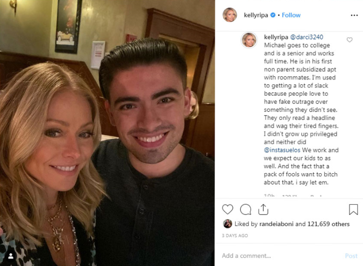 "Michael goes to college and is a senior and works full time," Ripa wrote in response to a fan asking if Michael dropped out of school amid the headlines surrounding Ripa's comments. "He is in his first non parent subsidized apt with roommates. I'm used to getting a lot of slack [sic] because people love to have fake outrage over something they didn't see. They only read a headline and wag their tired fingers."