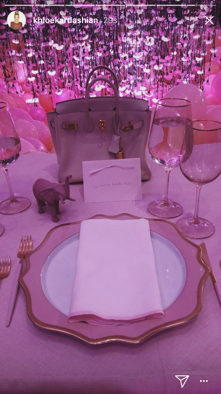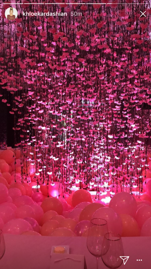 The 33-year-old reality star, who is expecting a baby girl with Tristan Thompson, showed off her stunning pink-filled baby shower at Hotel Bel-Air on Instagram Stories on Saturday, which was hosted by Amazon Baby Registry. In the pics, there are hundreds of rose-colored balloons on the ground with pink flowers dangling from the ceiling, pink table settings and lighting. There's also a neon sign that says, "Baby Thompson."