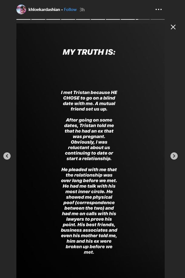 Khloe then recalls how she first met the 28-year-old NBA pro. "My truth is: I met Tristan because HE CHOSE to go on a blind date with me. A mutual friend set us up," she writes. "After going on some dates, Tristan told me that he had an ex that was pregnant. Obviously, I was reluctant about us continuing to date or start a relationship."