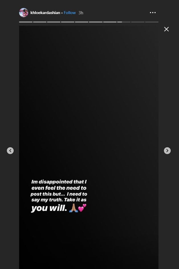 The Instagram message comes after several news outlets recently cited court documents reportedly filed in November 2018 by Tristan's ex over child support. In the reported documents, it's alleged that Khloe was seeing the Cleveland Cavaliers player while he was still in a relationship with the mother of his son.