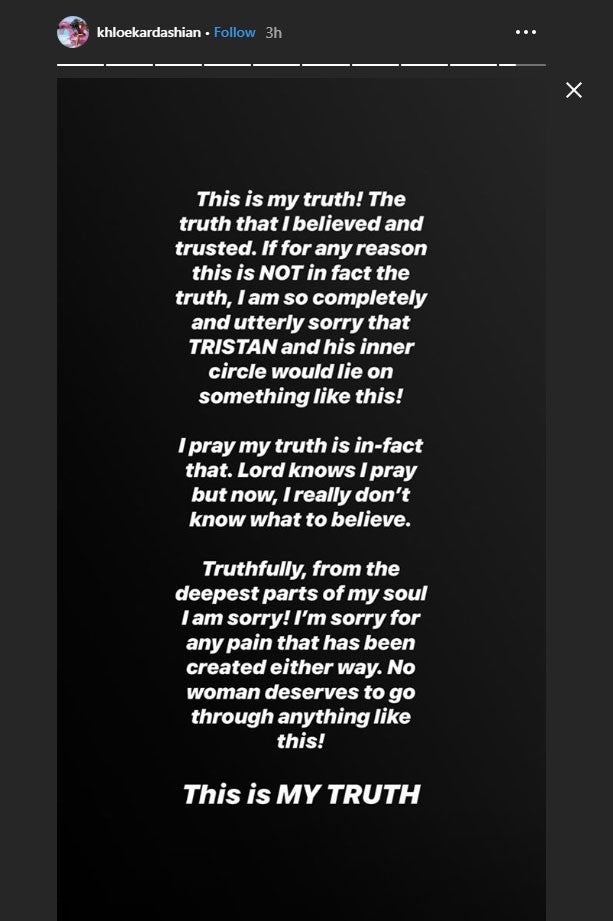 "This is my truth! The truth I believed and trusted. If for any reason this is NOT in fact the truth, I am so completely and utterly sorry that TRISTAN and his inner circle would lie on something like this!" she continues. "I pray my truth is in-fact that. Lord knows I pray but now, I really don't know what to believe. Truthfully, from the deepest parts of my soul I am sorry! I'm sorry for any pain that has been created either way."