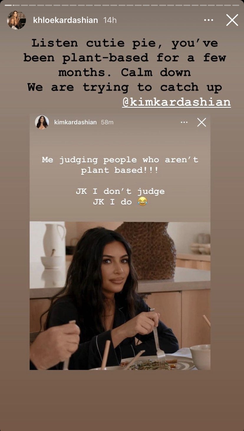 Khloe reposted the Instagram Story writing, "Listen cutie pie, you've been plant-based for a few months. Calm down, we are trying to catch up."