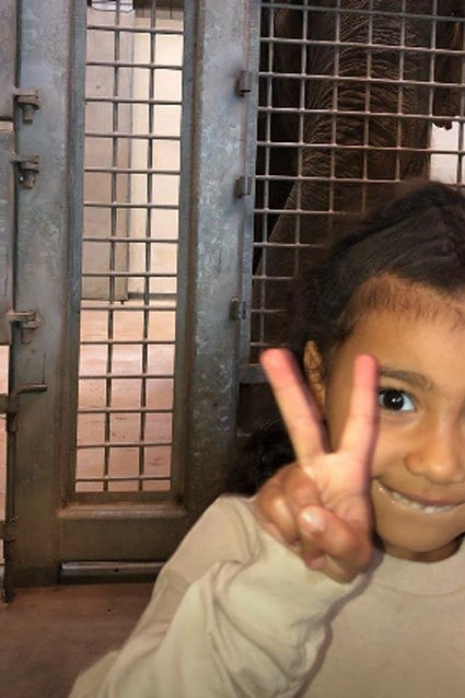 North certainly wasn't shy while posing for pics snapped by her famous mama, adorably cheesing in front of a rhino cage.