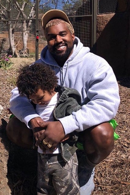 While Kim and her mini-me were having a photo shoot, Kanye and Saint were also spending some quality time together. Kanye was all smiles, cuddling up close to their toddler, who was sweetly dressed in what appears to be a kid-version of the new camouflage pants from the rapper's latest Yeezy collection.