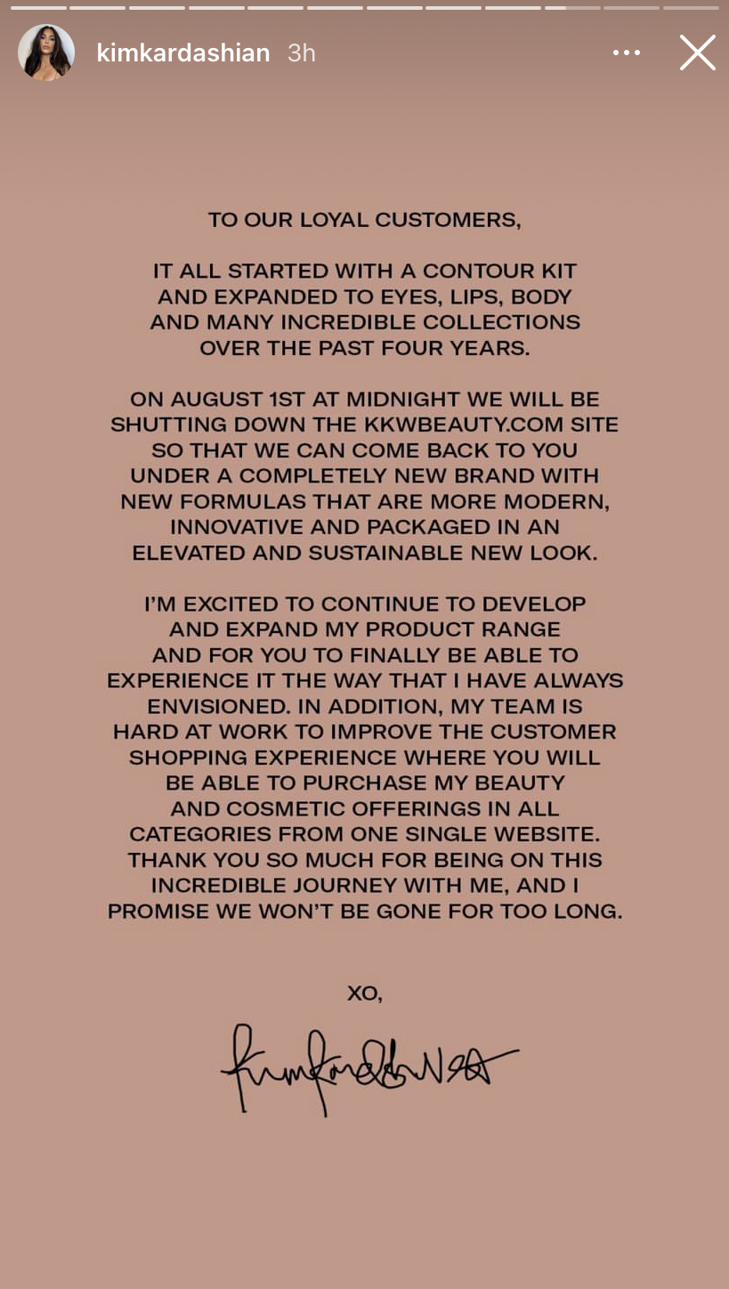 "On August 1st at midnight we will be shutting down the KKWBeauty.com site so that we can come back to you under a completely new brand with new formulas that are more modern, innovative, and packaged in an elevated and sustainable new look," she continued.