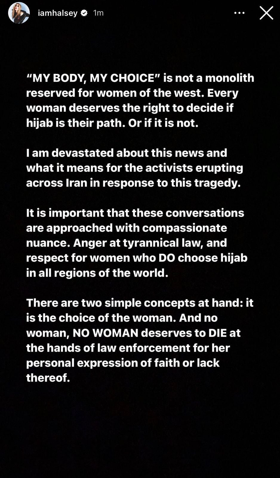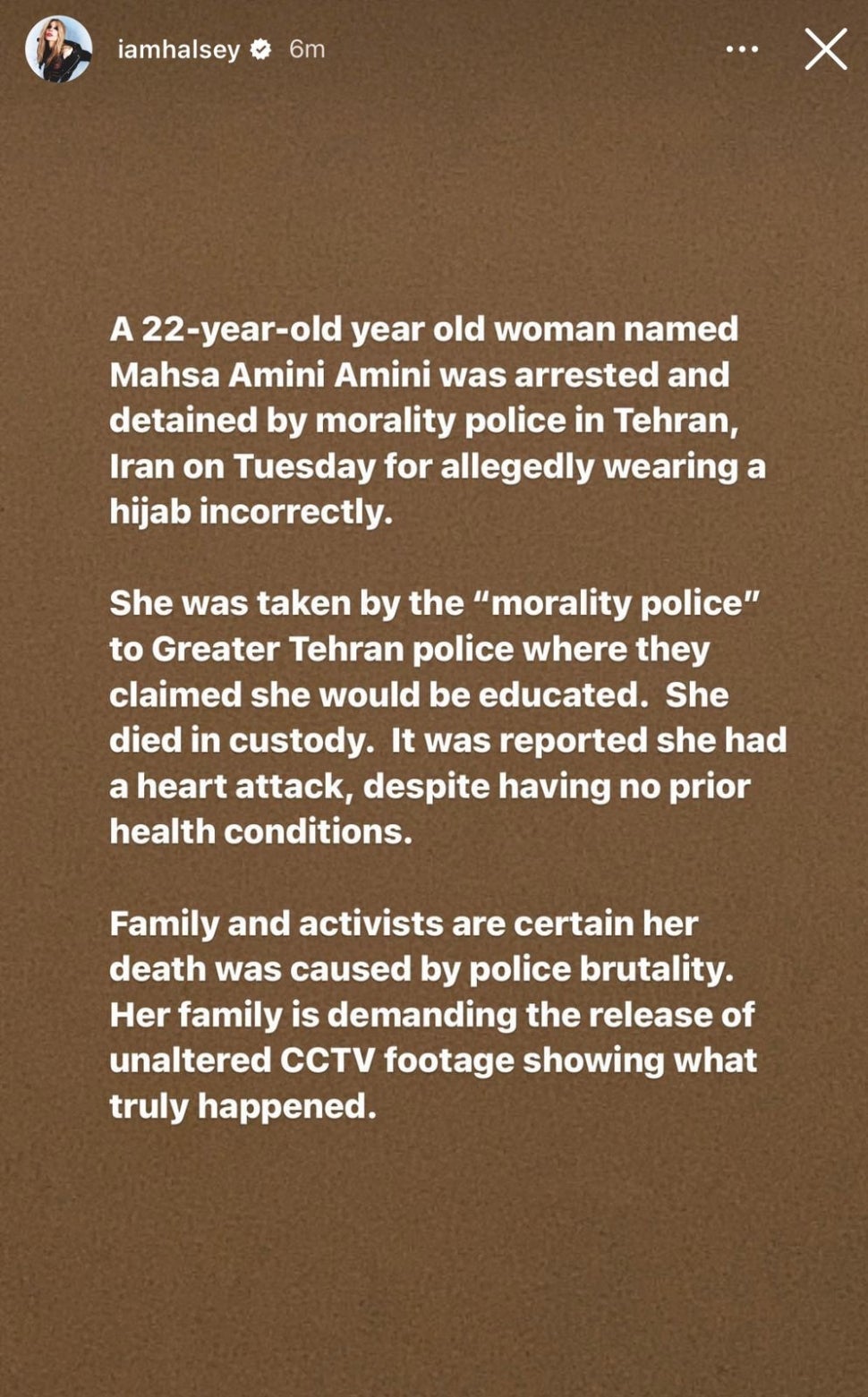 "#mahsaamini Just wow … 💔Rest in peace #mahsaamini You did not deserve this . Sending blessings to her family and loved ones," the supermodel wrote, alongside a photo of Amini and a slideshow from Middle East Matters, which explained, in detail, what happened to Amini and how the world can help spread her story.
