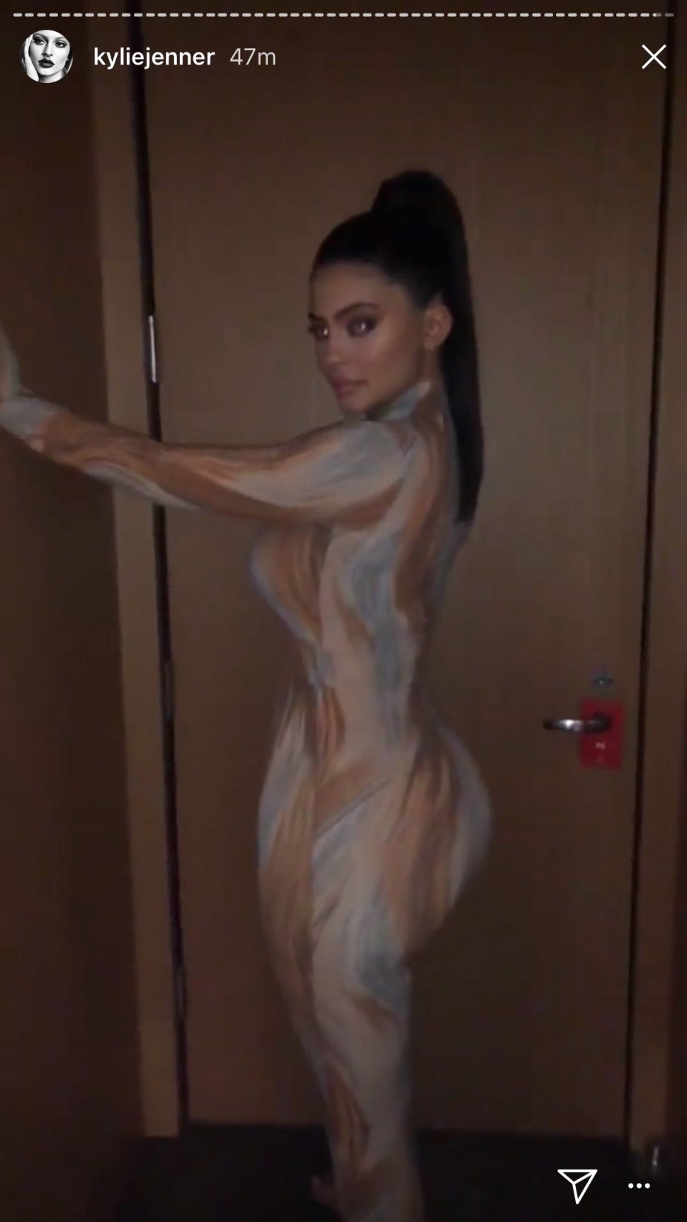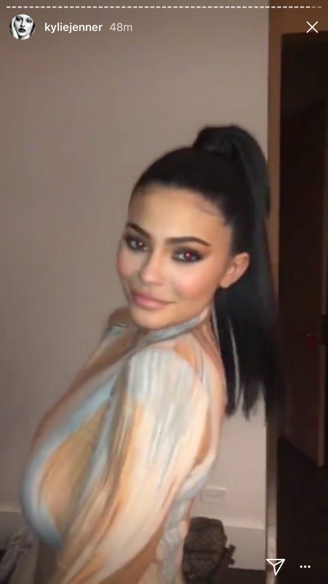New mom Kylie, 20, chose to look like a painting, showing off her curves in a skintight, long-sleeved tan-and-silver patterned turtleneck maxi dress, which she let do all the talking by wearing her hair in a high ponytail that Ariana Grande would be very proud of, as well as accessorizing with nude heels.