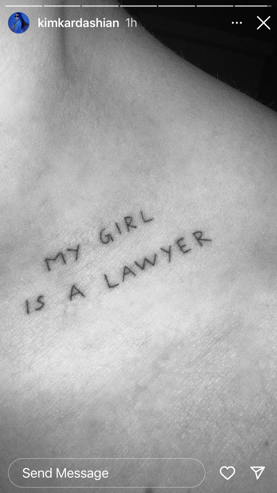Posting a black-and-white pic to her Instagram Stories, Kim shared the ink, which reads, "My girl is a lawyer."