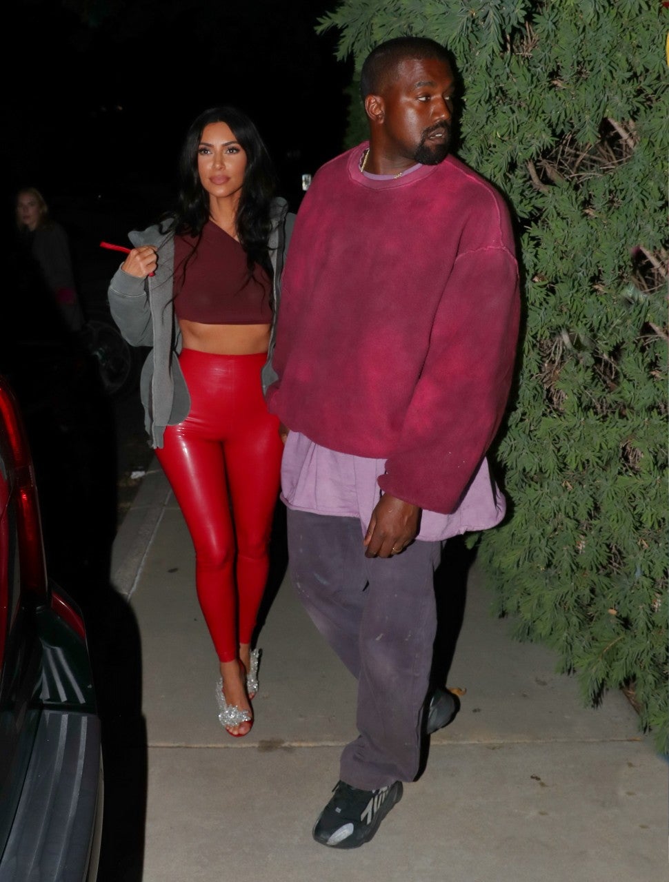 As for Kanye, he looked more comfy for the movie party, stepping out in black sneakers, loose pants, a purple T-shirt and a maroon sweatshirt.