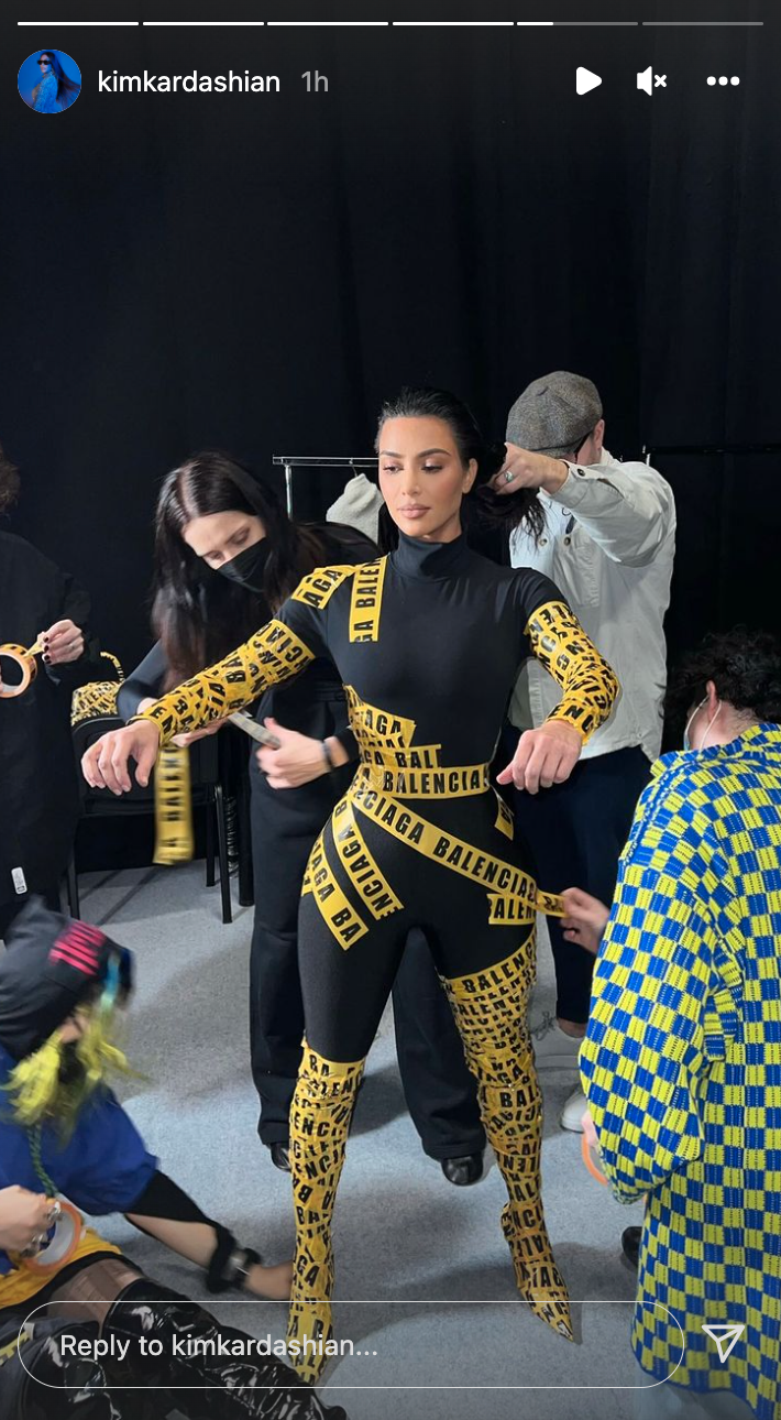 Kardashian also shared some BTS moments from the show on her Instagram Story, including a video which showed her getting wrapped in the caution tape before the show. Kardashian appeared to be in a black head-to-shoe bodysuit, which was then wrapped in the Balenciaga packing tape.