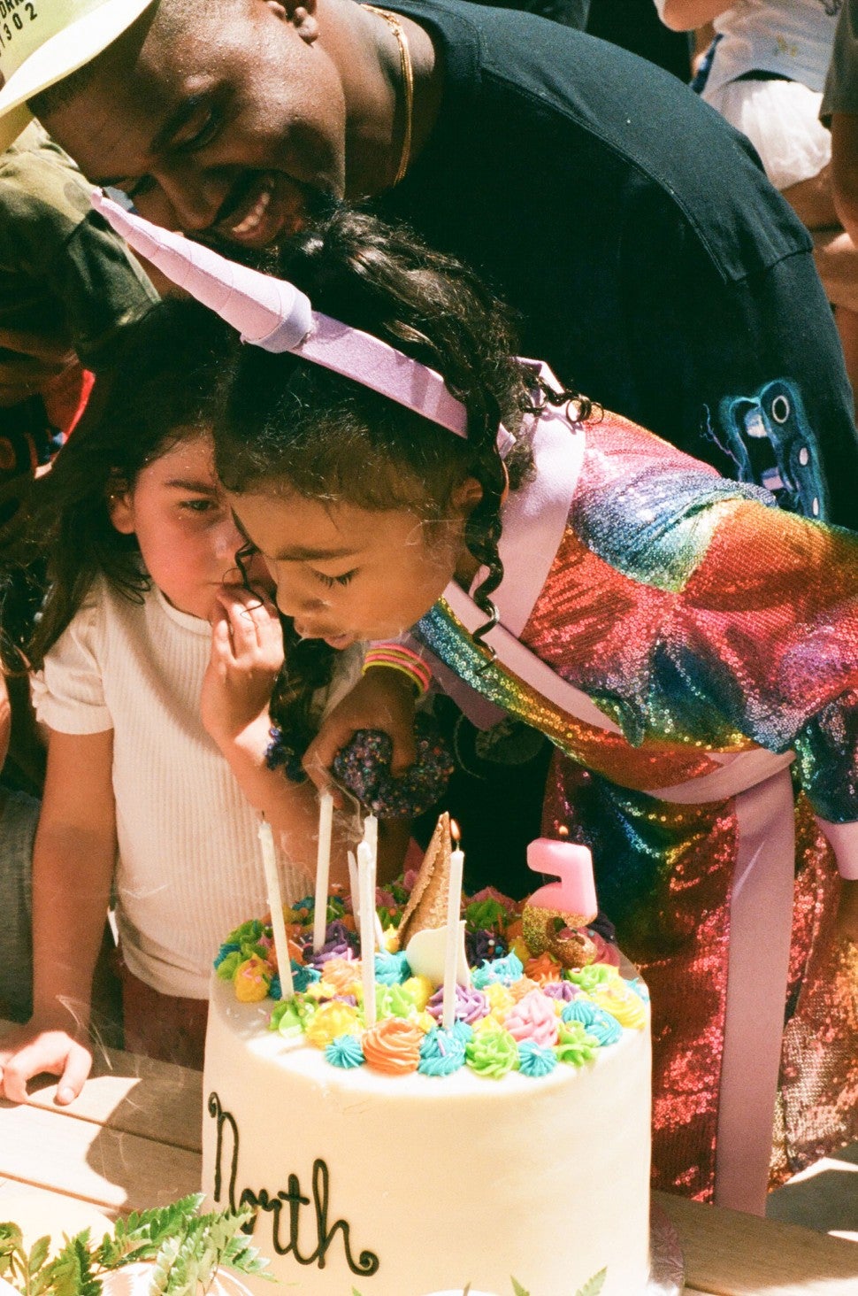 North and Penelope also chowed down on identical unicorn candy-filled birthday cakes at their party as they looked adorable in their matching rainbow bathing suits!