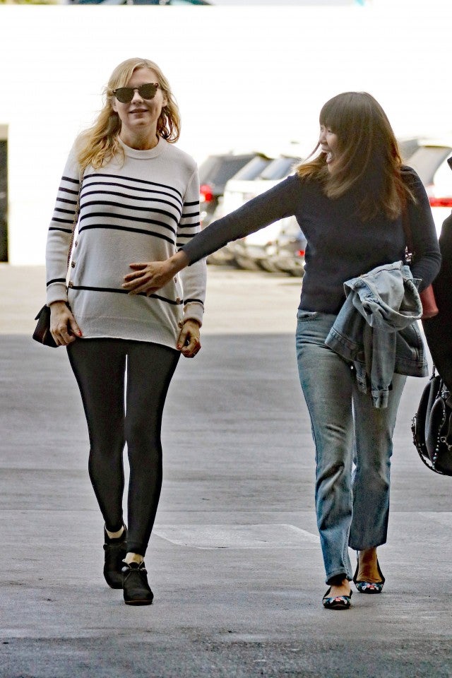 Then on Thursday, Dunst was spotted grabbing lunch with her soon-to-be in-laws in Toluca Lake, California, and a baby bump seemingly appeared visible through her gray tunic, which she paired with a black jacket, leggings and boots. The actress is engaged to her Fargo co-star, Jesse Plemmons.