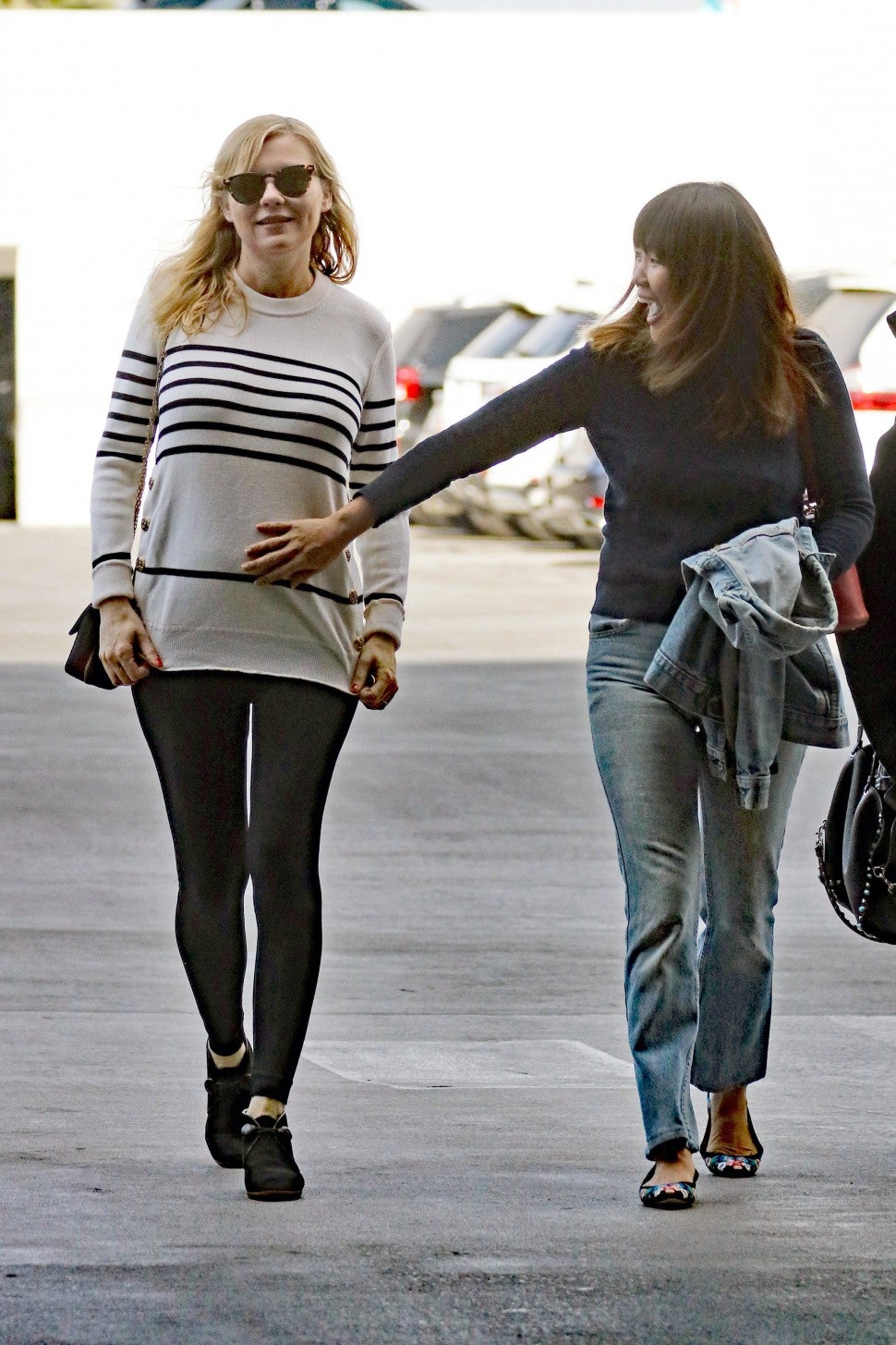 Dunst's pal excitedly rubbed her belly as they walked to their car after visiting an office building.