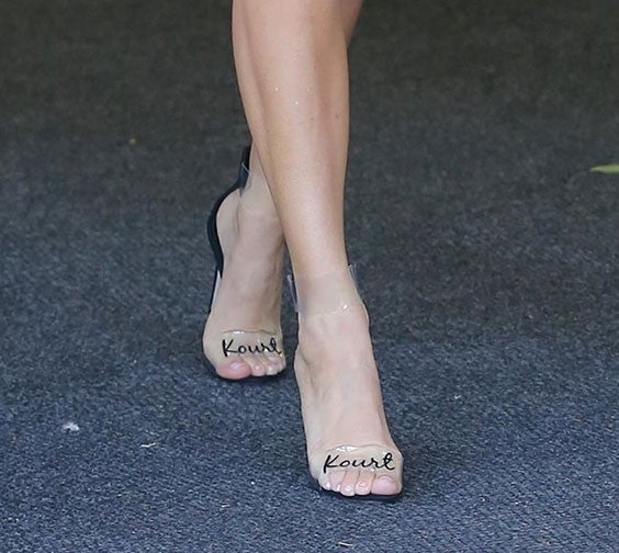 Kourtney rocked an off-the-shoulder, cotton poplin long-sleeved Milly top tucked into light-wash denim cut-offs, but it's her accessories we can't get enough of -- very '80s sunglasses and a clear pair of heels with "Kourt" written on the front straps in script. She finished off her look with a sky-high top knot.