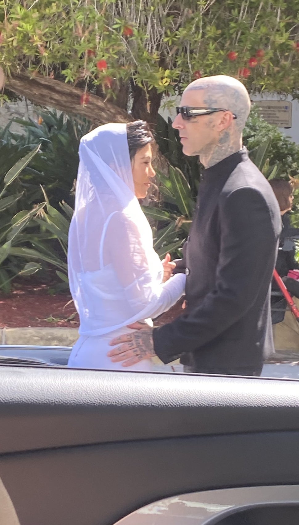 "Travis wore a black tuxedo and Kourtney was in a white dress. Kourtney's grandma MJ was there and so was Travis' dad," the eyewitness says. "They posed in a black convertible that had a 'just married' sign and cans rattling from it in the back. They then exited the car and walked towards the courthouse privately. It seemed very low key and not many people were around. They had their own set of cameras and crew with them."