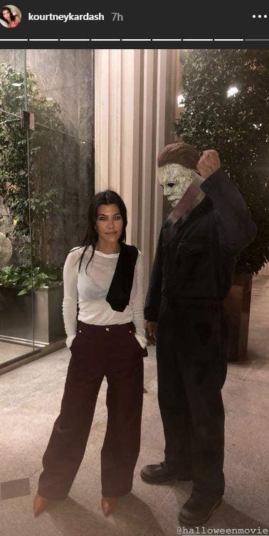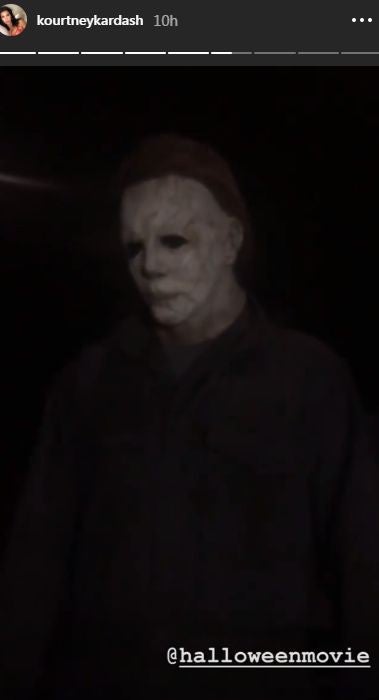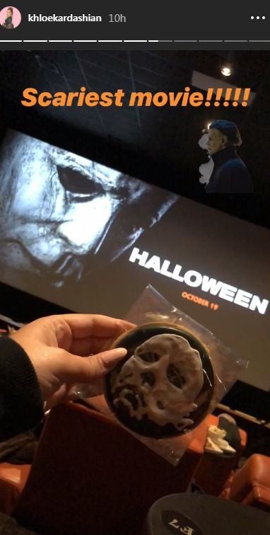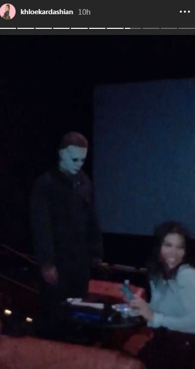 Kourtney, Khloe and Larsa all took to their Instagram Stories to document their movie experience, which began with an actor walking around the theater, spooking out the crowd while dressed as the film's iconic masked killer, Michael Myers.