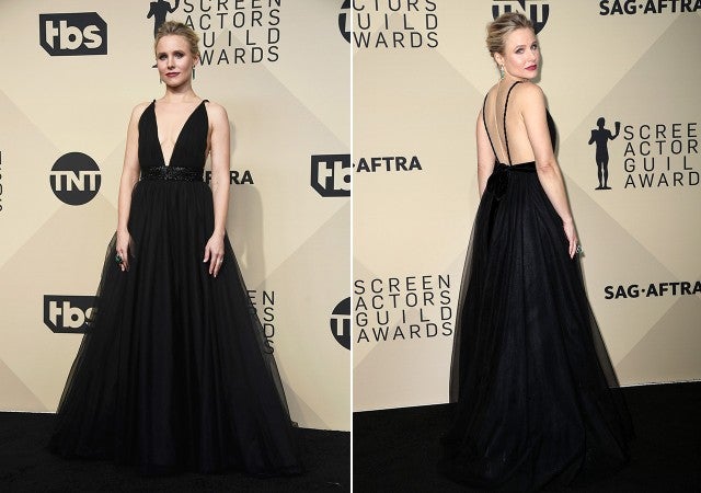 But it was her final look of the night that really wowed. Bell greeted SAG winners backstage after their wins in a stunning Yanina Couture black gown with a full skirt, open back, and plunging neckline. She swept her blonde locks back in a sleek up-do.