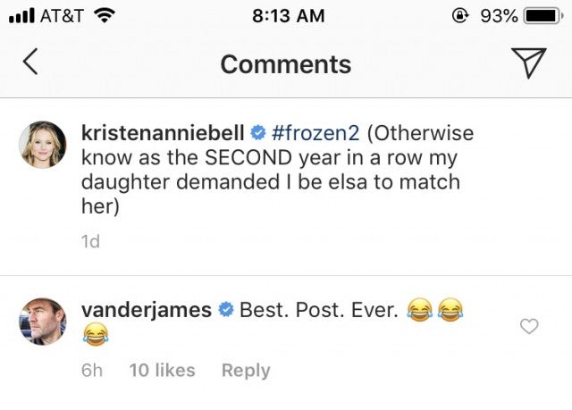 “#frozen2 (Otherwise [known] as the SECOND year in a row my daughter demanded I be Elsa to match her),” Bell captioned a mirror selfie where she’s wearing Elsa’s gown with an annoyed look on her face.