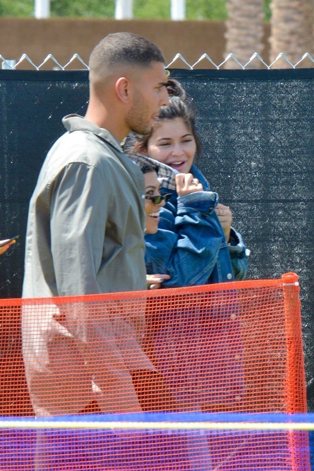Just hours after sharing pics and videos from the tarmac before taking off on their private plane, Kourtney Kardashian and Kylie Jenner have arrived at Coachella. The sisters were photographed picking up their VIP passes at the festival with their respective boyfriends, Younes Bendjima and Travis Scott, as well as Kylie's BFF, Jordyn Woods.