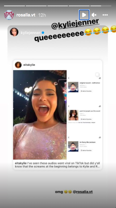 The 24-year-old pregnant makeup mogul took to her Instagram Stories over the weekend, sharing a fan's discovery that audio of two girls screaming, which has become part of a major trend, actually originated with Kylie and singer Rosalia screaming together in a video.