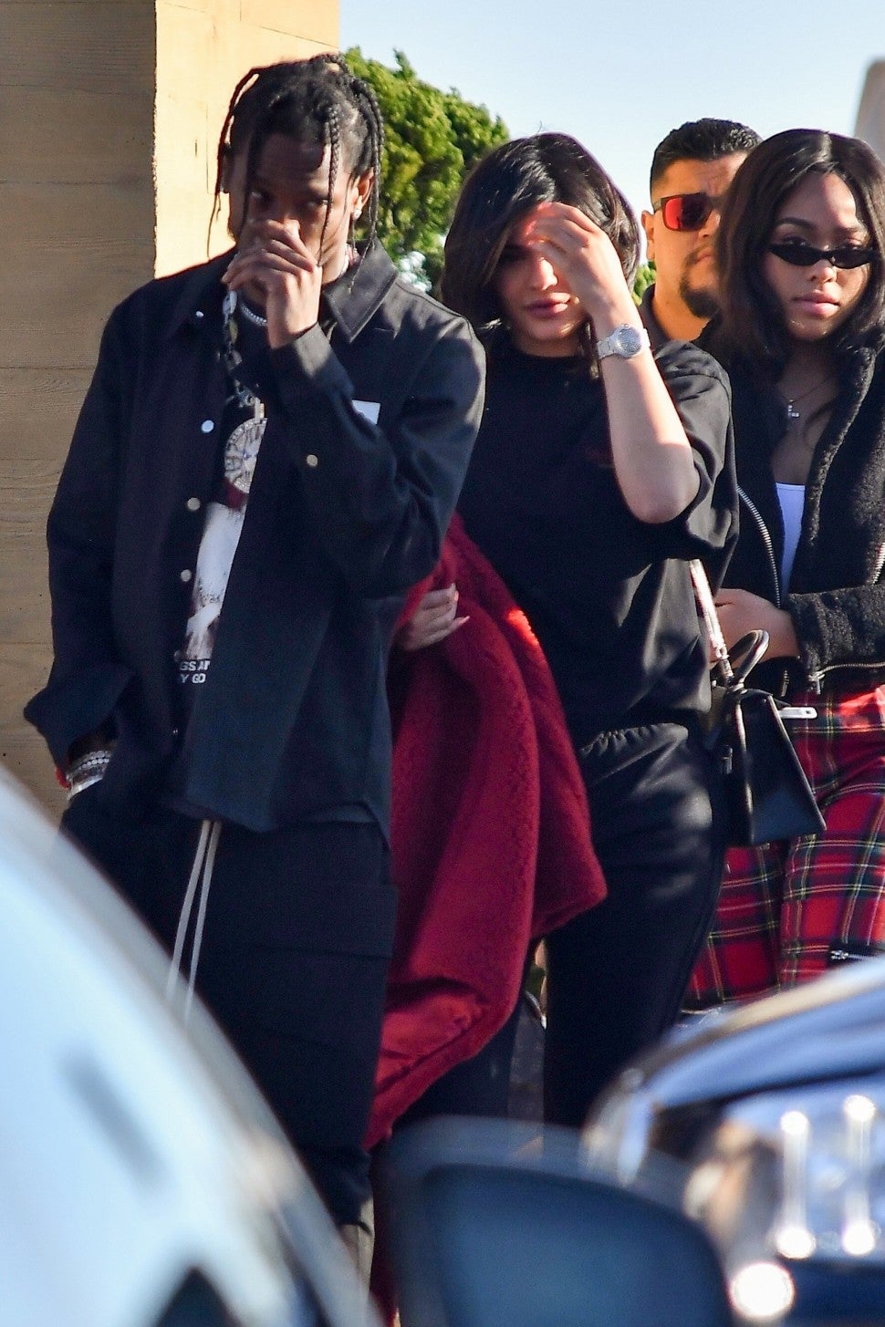 That same day, Jenner and Scott were spotted with a handful of friends, including Jordyn Woods, grabbing lunch at Nobu in Malibu, California. The makeup mogul wore black pants with a matching loose top and was carrying a burgundy jacket. Meanwhile, the rapper was in black pants, a tee and black jacket.
