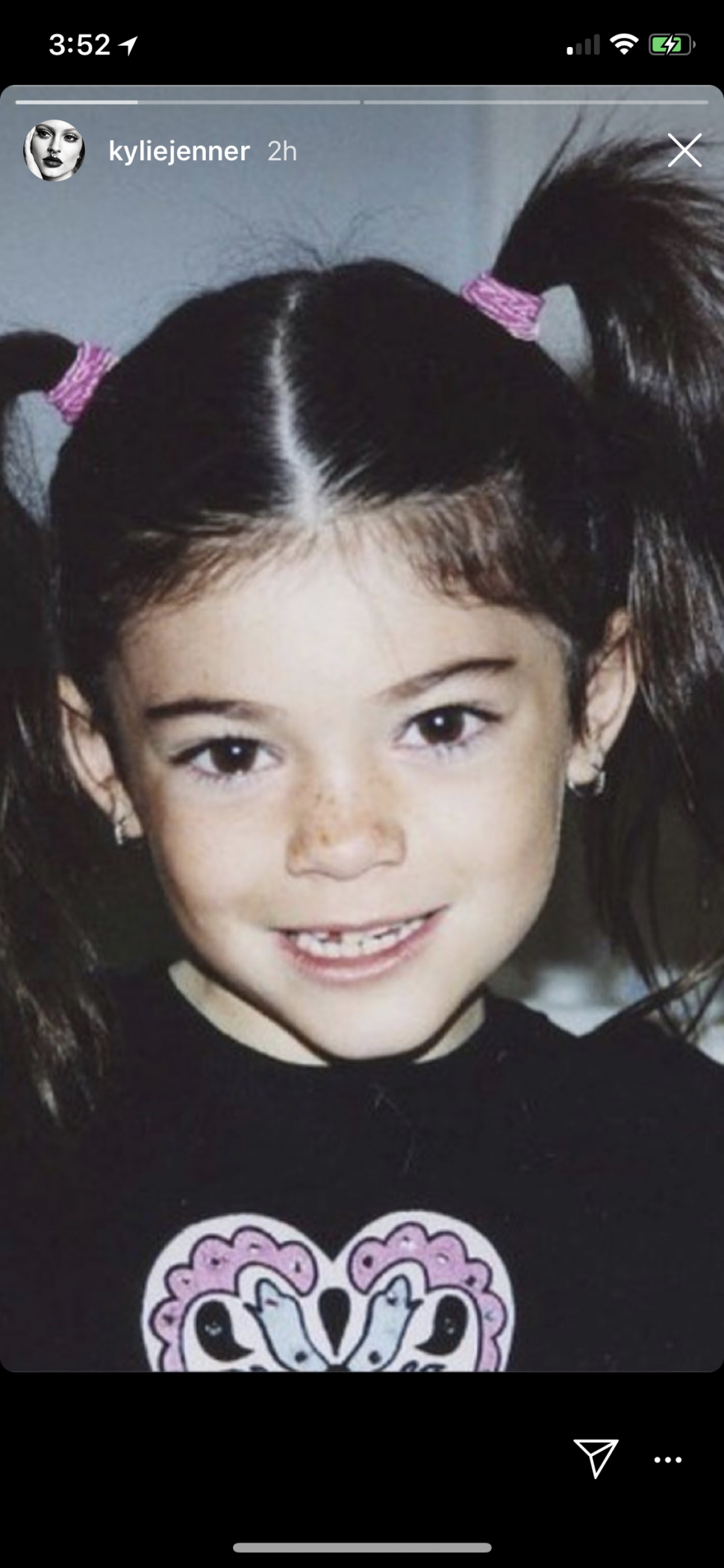 The makeup maven first shared a sweet snap of herself as a kid rocking pigtails, with her freckles, and pierced ears on display. Next, she posted a side-by-side snap of herself rocking bangs both as a young girl and a young woman. It won't be long until Jenner's own daughter, 6-month-old Stormi, reaches the age Jenner was in the photographs.