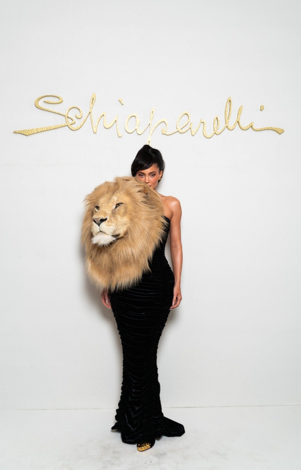 Kylie Jenner clearly wasn't wild about sharing her unique lion look during Paris Fashion Week! The 25-year-old reality star and makeup mogul attended the Schiaparelli Haute Couture show on Monday, wearing a strapless, black velvet bustier Custom Schiaparelli Haute Couture gown designed by Daniel Roseberry with a giant lion's head bust attached to her shoulder. The lion was made by hand-sculpted foam, wool and silk faux fur and painted to look lifelike. Kylie also sported a golden tan from celebrity tanner Isabel Alysa, similar to the faux-lion's mane.