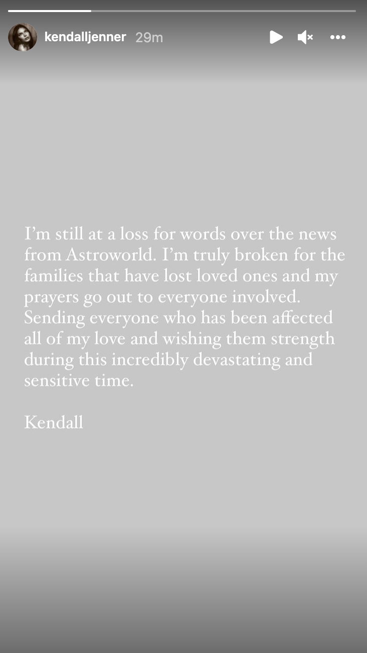 Kendall wrote her own post, saying, "I'm still at a loss for words over the news from Astroworld. I'm truly broken for the families that have lost loved ones and my prayers go out to everyone involved. Sending everyone who has been affected all of my love and wishing them strength during this incredibly devastating and sensitive time."
