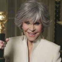 Jane Fonda reacts to being honored with the Cecil B. DeMille Award at the 78th Annual Golden Globe Awards, which aired on NBC.