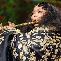 Lizzo is wearing a black and gold coat from Thom Browne at the 2022 Met Gala.