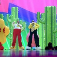 The reggaetoneros performed their song from their joint album, 'Oasis,' on Monday night.