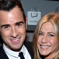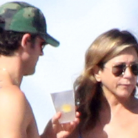 The actress was joined by her shirtless husband, Justin Theroux, on the trip.
